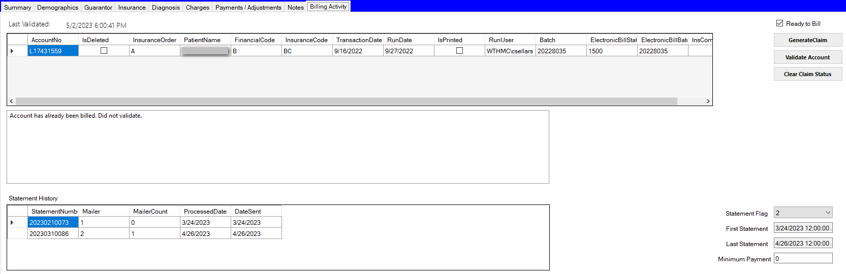 After errors have been corrected, click the Validate Account button to revalidate. If the account has no errors, it can be marked Ready to Bill by checking the Ready to Bill checkbox. This will flag the account to be picked up by the claims job to be sent to the billing clearinghouse.