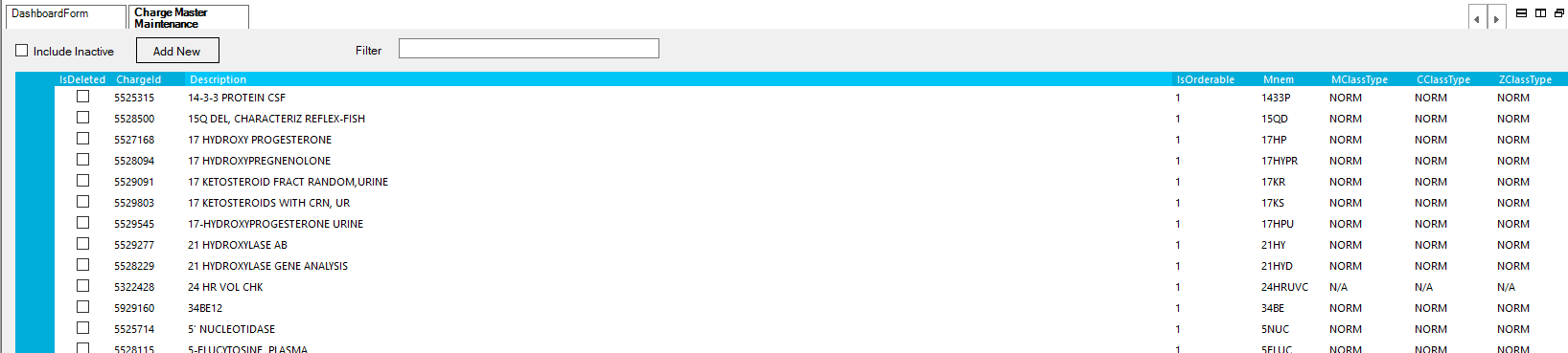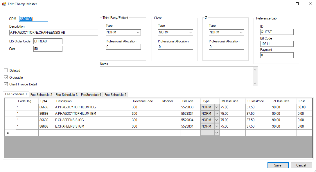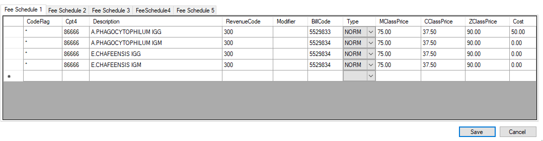 The Fee Schedule tabs are where specific billing lines are entered for this CDM. There are 5 tabs for the 5 Fee Schedules. The fee schedule used is determined by the client.