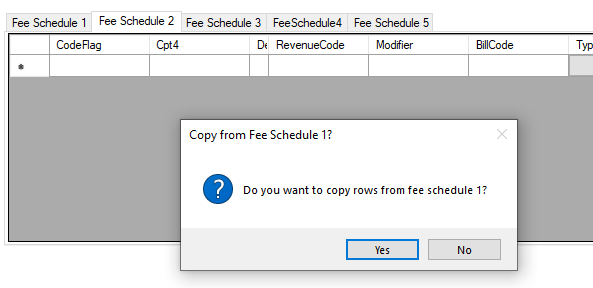 When finished adding lines for Fee Schedule 1, go to other Fee Schedule tabs. If there are no lines on the other Fee Schedule, the app will prompt you to copy the lines from Fee Schedule 1. Click Yes to populate the tab from Fee Schedule 1. That fee schedule can then be edited for information specific to that schedule.